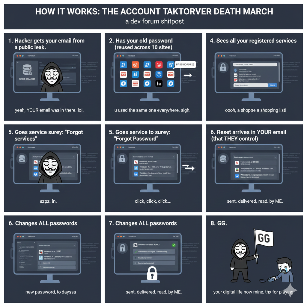 Y vos, con un correo que tiene 5 filtraciones conocidas, conectado a banco, proyectos, clientes, hosting, todo.